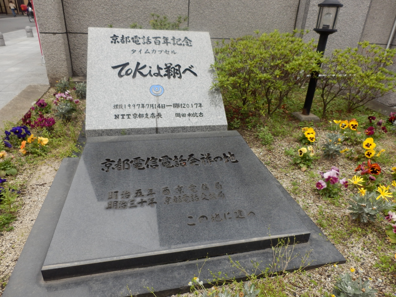 明治五(1872)年に京都の西京で電信局が開設され、明治三十年になると西京電話交換局が業務を開始した、その電信電話発祥の地に碑が建てられていた、そこに京都電信百年記念のタイムカプセルが埋設としたことを記す碑があった、埋設は1997年7月14日、開封2017年<NTT京都支店の東南角にある>、地下鉄烏丸御池駅南出口から徒歩5分の三条通に面しています