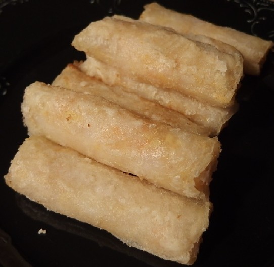 米から作ったオブラートのような薄皮の威化紙(ウエハーシィ)で海老をたっぷり包んて揚げたのが明蝦巻!!