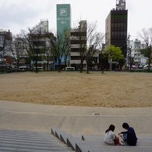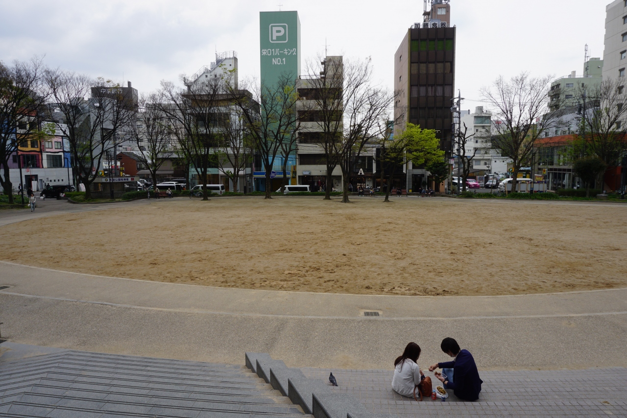矢場公園は、栄のナディアパークの南側に隣接する公園。公園からナディアパークに向かって広い階段があるのですが、そこが恰好の休憩所になっています。ここの座ると正面は公園、後ろがナディアパークのビル。気分が晴れやかになるような空間です。