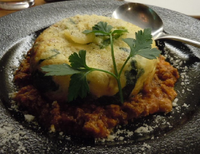 スペイン風オムレツはオムレツの下にボロネーゼが敷かれた創作系オムレツの具はポテトベースにほうれん草入り!