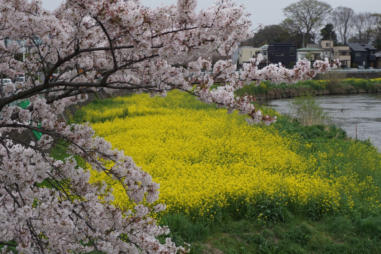 元荒川堤は、久伊豆神社に向かう途中。一面に咲く黄色い菜の花とちょっと盛りは過ぎていましたがピンクの桜が咲き競っているとても美しい景色がありました。このあたりは、越ケ谷御殿跡とか、建長元年板碑とかの史跡もちょこちょこある散策コースともなっています。