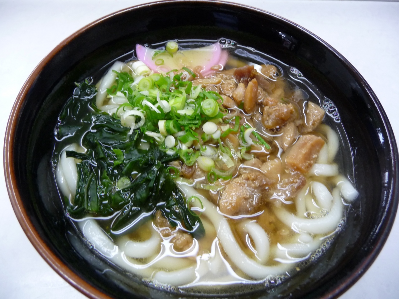 やわらかめのおうどん、甘辛のかしわ、わかめとかまぼこにねぎ。