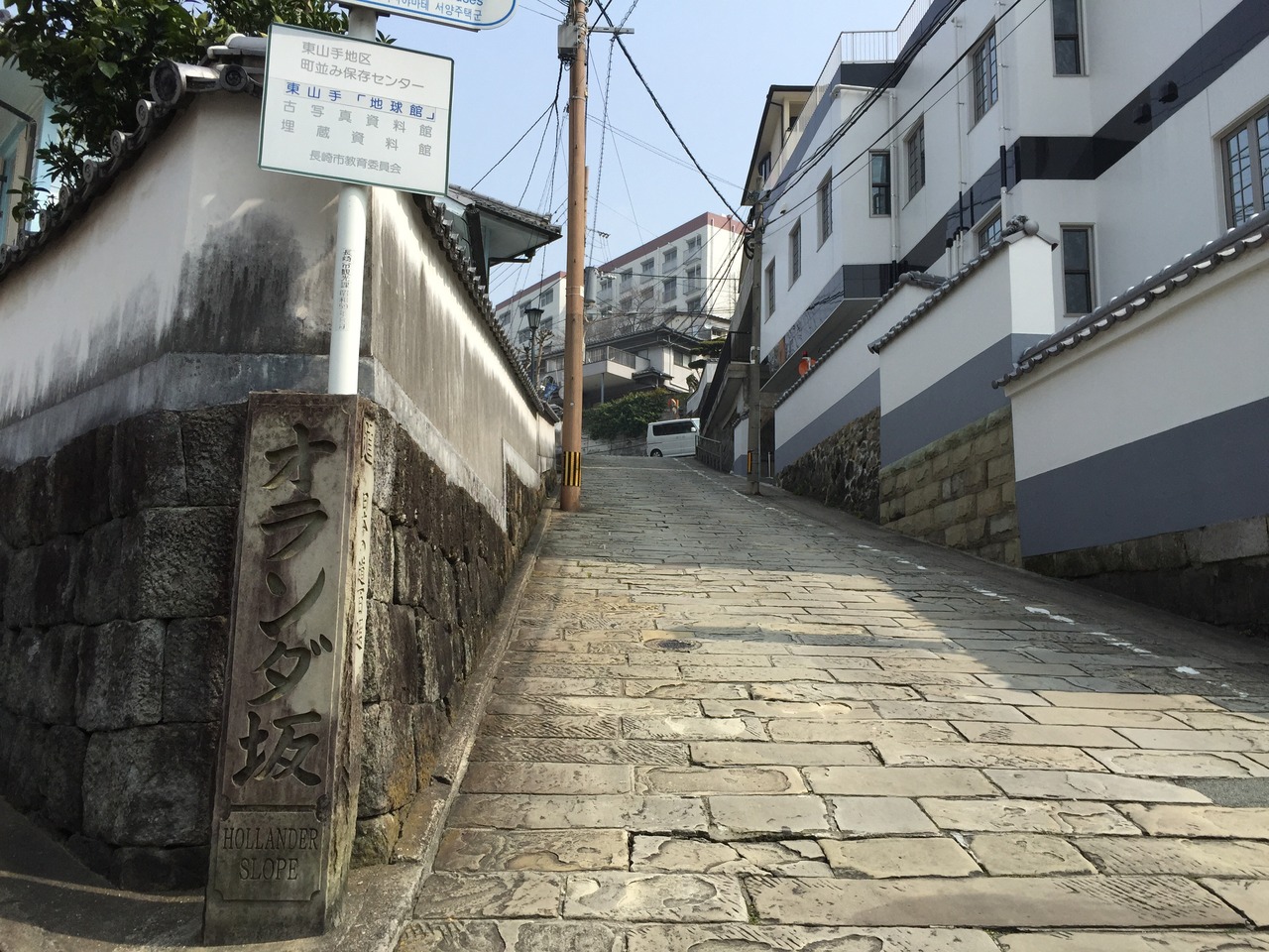 路面電車の終点である石橋電停から孔子廟方面にいくとあります。坂の途中にオランダ坂の碑があります。かなりの急坂ですので、登るのも一苦労です。活水女子大側からもアプローチは可能です。伝統的建造物群保存地区なので、雰囲気はいいです。