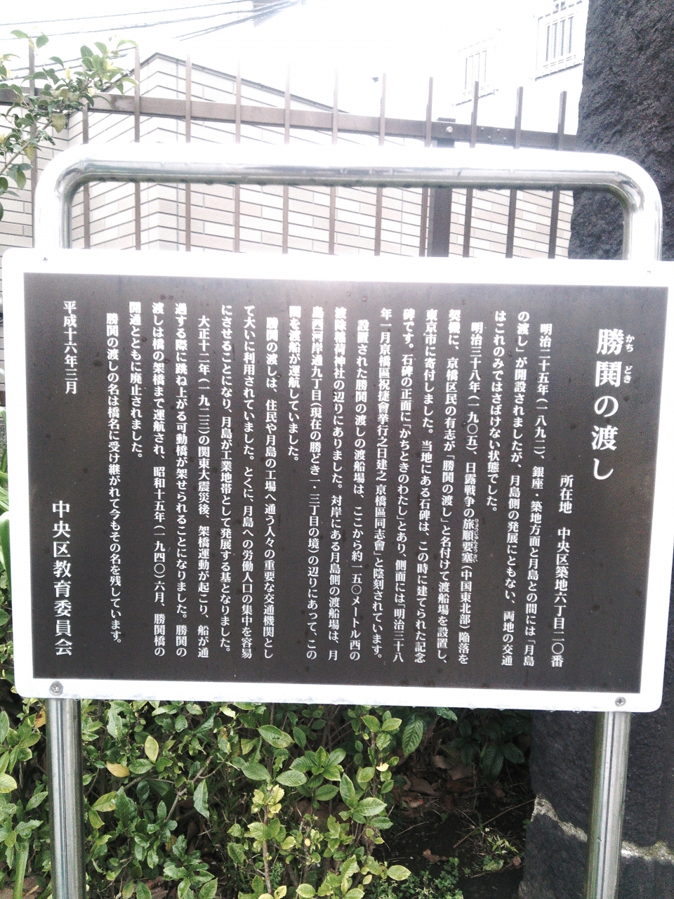 勝鬨、交通の要所でした。日露戦争の時代に京橋地区の住人が、設置したそうです。当時は波除神社のあたりにあっそうです。月島の発展にともない、架橋機運がたかまり、現在の勝鬨橋の設立になったそうです。交通の要所として、開閉式でした。