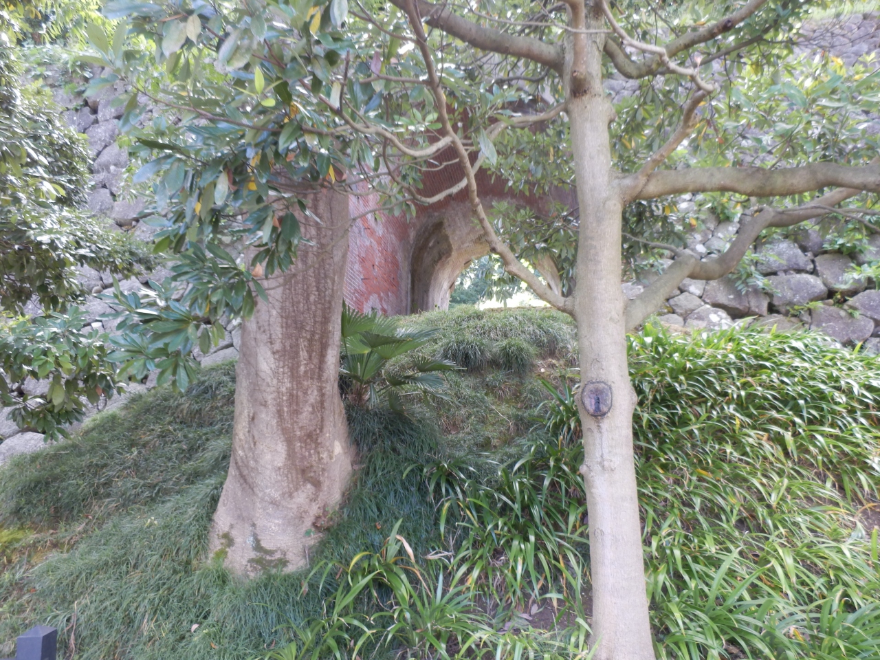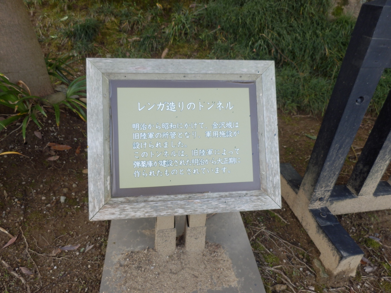 金沢城公園内にレンガ造りの施設があった,樹木が手前に茂っており見逃していたが、横からのぞき込むと何やら穴が開いた空間が見えた、すぐ横に石川県が設置した立札によると、明治から昭和にかけて金沢城は旧陸軍所管の軍事施設が設けられた、このトンネルは旧陸軍によって弾薬庫が建設された、明治から大正期に作られたものとされています<お詫び+住所が<兼六町1-1>は<丸の内1-1>の誤りです