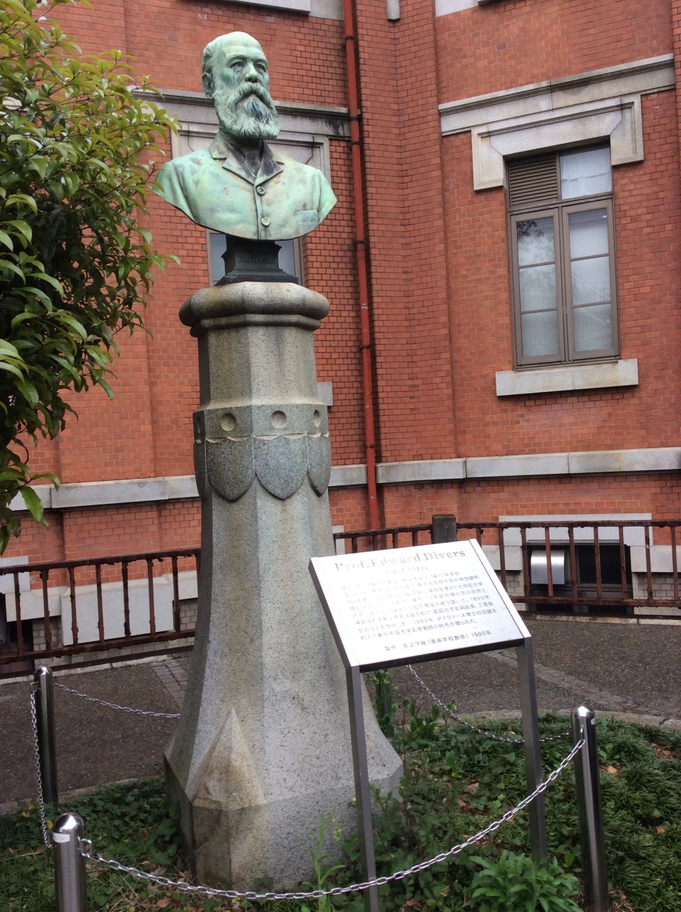 東京大学本郷キャンパス内の、理学部と御殿下記念館の間の植え込みの中に立っています。明治6年に来日し、工部大学校都検、帝国大学理科大学化学科の教授として、日本の化学の黎明期を支えた功績を記念して建てられた胸像です。