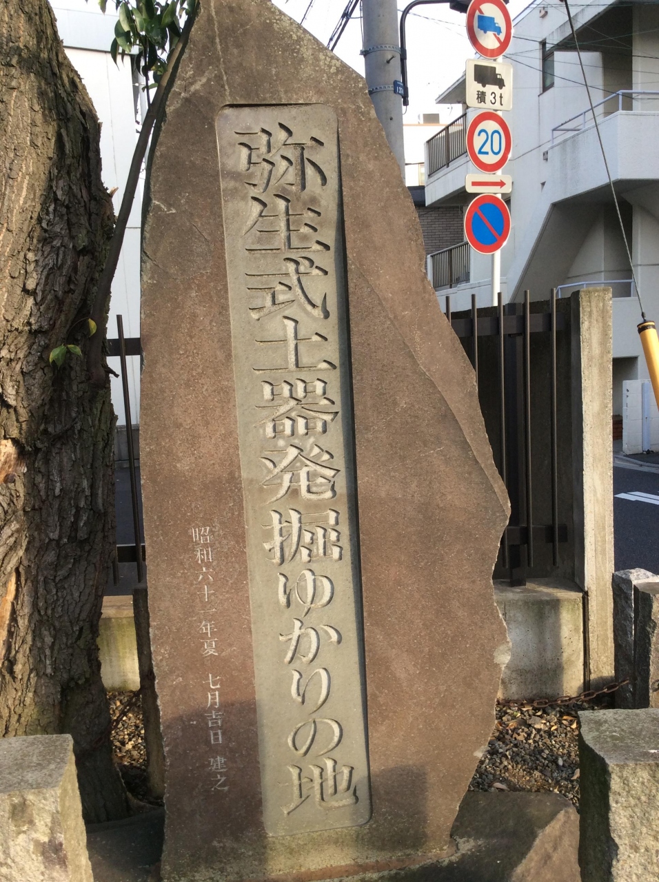 言問通りに面した所。東大の浅野キャンパスの近くにあります。東大の学生だった有坂鉊蔵が根津の谷から赤焼きの壺を発掘し、後に弥生式土器と命名されたが、発掘候補地は数カ所あったため発掘ゆかりの地となっているようです。