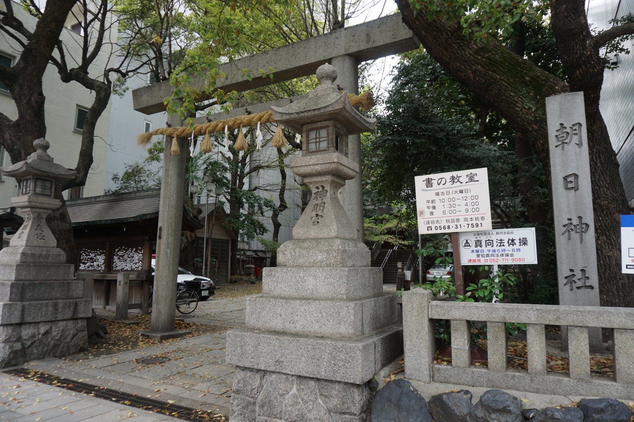 朝日神社は、栄広小路通り沿い。都会の真ん中なのですが、境内はそれなりに広くて、本殿の辺りとか木々に囲まれて薄暗くなっています。