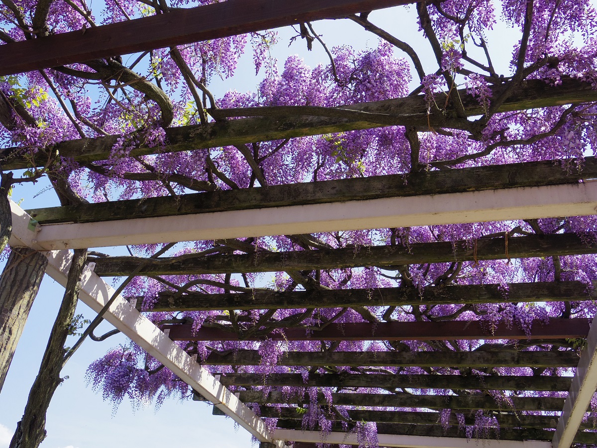 4月終わりで3~5分咲きだったので、5月初めごろにまた行こうと思います。藤棚の下にはベンチもあり、とてもいい香りがします。