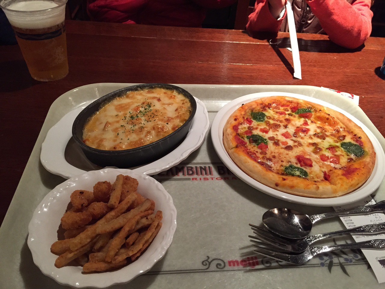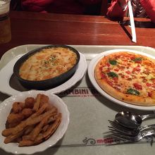 注文したお料理は、ピザ(670円)、シーフードドリア(820円)、えびとゴボウのフリット(300円)