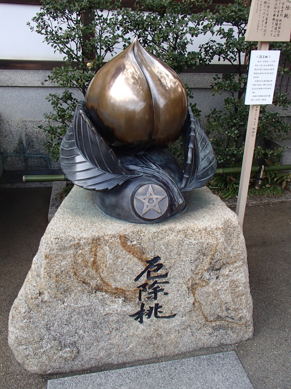 本殿に向かって左側には安倍晴明公の像が鎮座し、向かって右側には“厄除けの桃”が置かれています。