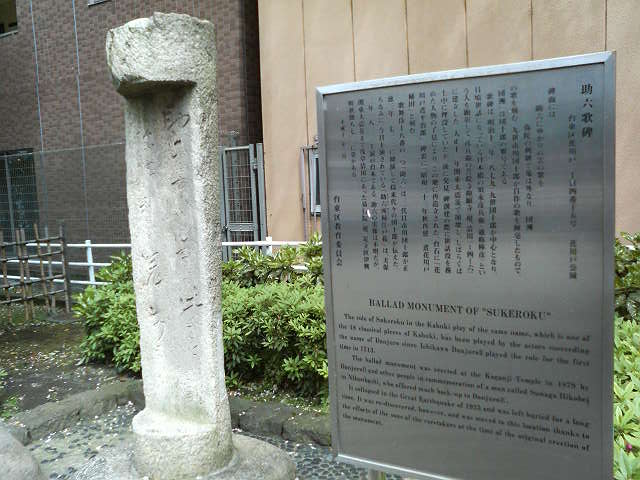白い古ぼけた石碑の横に「助六歌碑」という案内板があり、それによると明治時代の物で、九世・市川団十郎が自作の歌を揮毫したものとのこと。