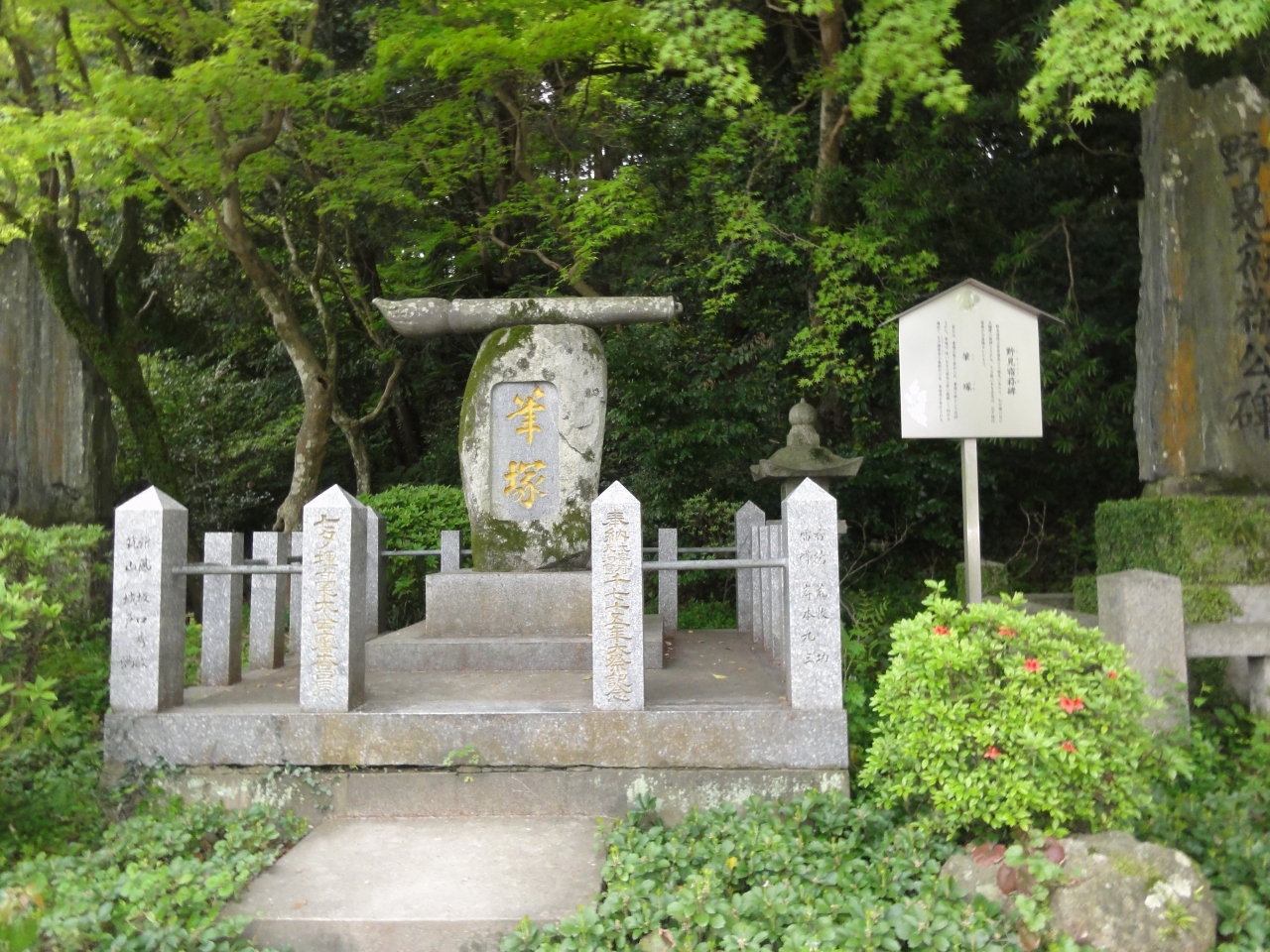 本殿裏の奥の方にひっそり建ってます。筆を供養し納めるところです。近くには料理人に建てられた包丁塚もありました。菅原道真は書の三聖公の一人で、書道上達成果を競う大会も天満宮で開かれてるそうです。その大会後に古い筆を塚に納める筆塚祭もおこなわれるとのことです。その時だけは賑やかになるのでしょうね。ツアーじゃなかったので発見できました。