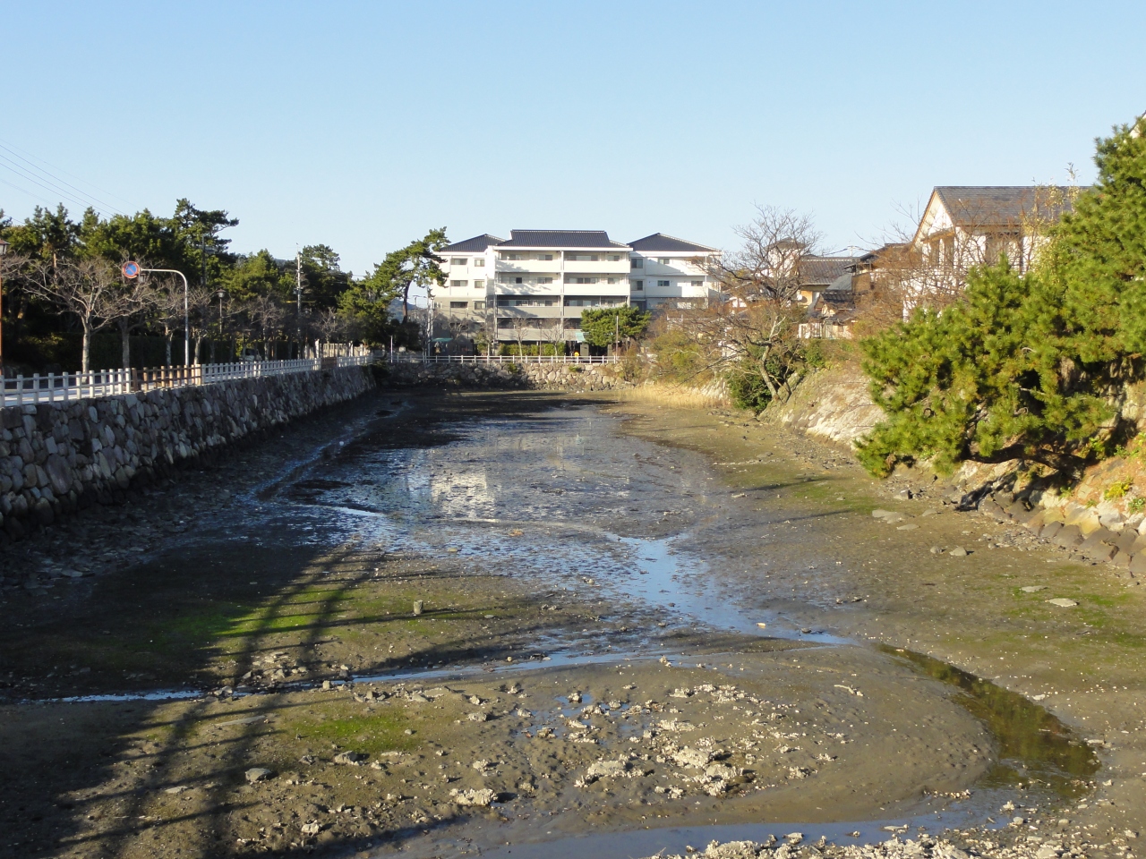 唐津城の西側にあります。広い川の様なお堀なので、お堀とは気が付かないで通り過ぎる人も多いと思います。堀のお城とは対岸にある、時の太鼓と橋でつながっていますので、橋の上からは二の門堀の全体が見渡せました。