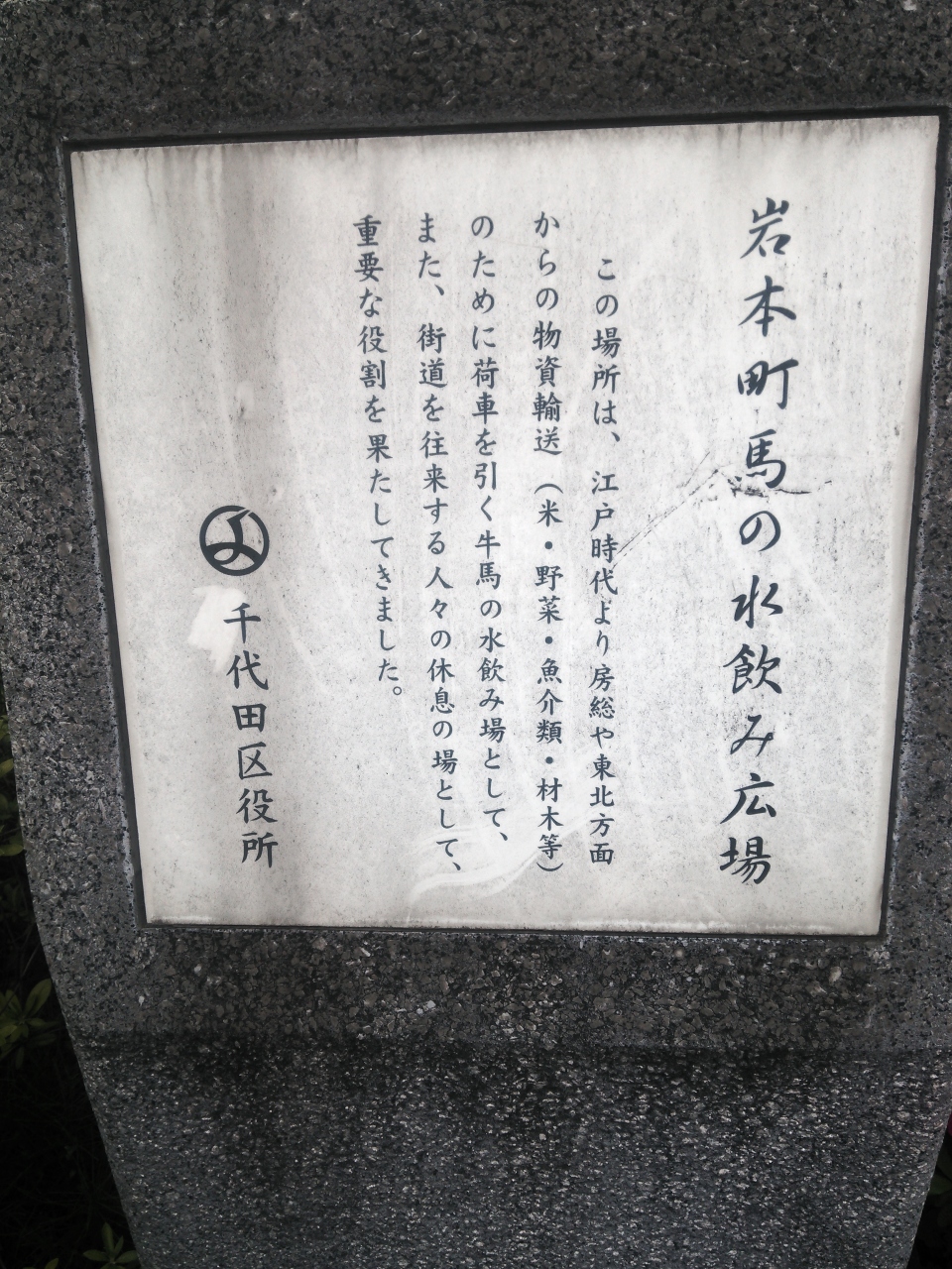 岩本町の交差点にあります。都営線岩本町駅から徒歩1分、JR秋葉原昭和通り口から徒歩3分程度です。江戸時代に、馬車と使う陸上運搬の休憩の場として、ここに水飲み場があったそうです。昭和通り自体は、関東震災後にできた幹線道路です。