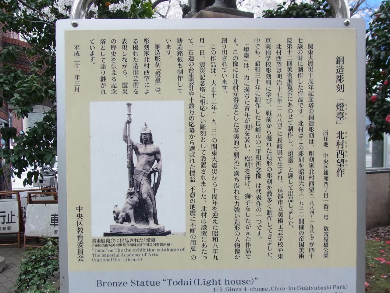 数寄屋橋交差点の交番の裏手にヒッソリと建っています。普段は、休憩や待ち合わせの人がいるちょっとした広場になっていますが、ほとんどの人が気づかずに通り過ぎていきます。ジャンボ宝くじの発売時は、行列で賑わいますが誰も気づいていないでしょう。