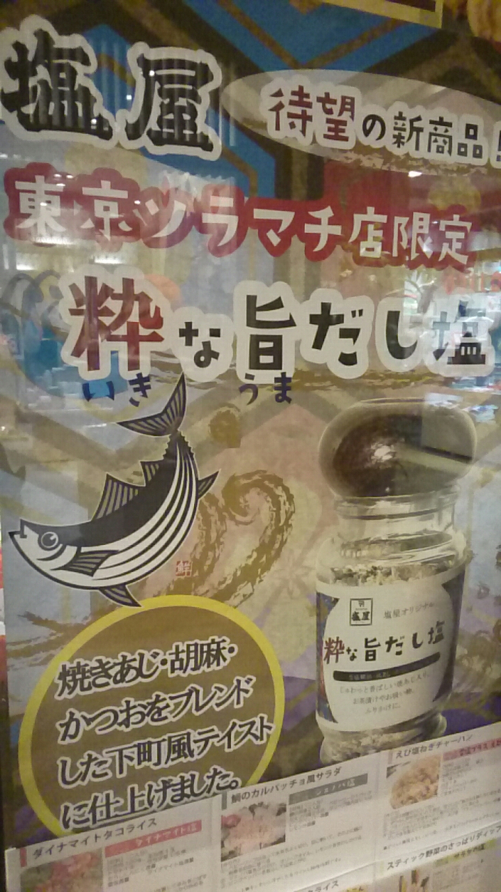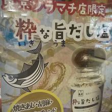 さまざまな塩が販売されているお店で、もともとは沖縄のお店だったように記憶しているのですが、最近では東京や大阪にも出店しているようです。東京ソラマチ店では、こちらの店舗限定の粋な旨だし塩が販売されていました。