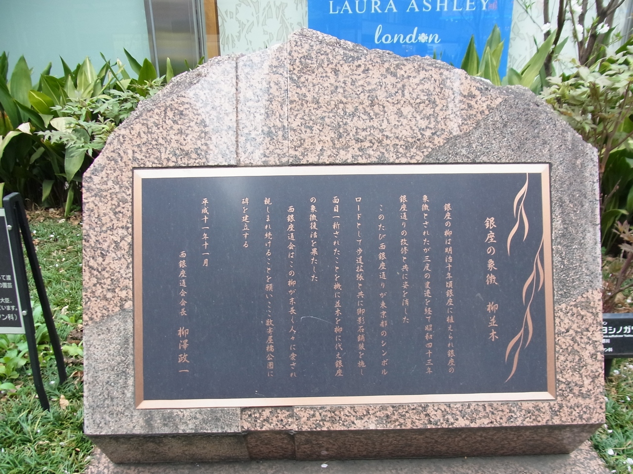 数寄屋橋交差点の交番裏の数寄屋橋公園内を東京側へ歩いていくと石碑が幾つか並んでいて、その中のひとつ。昔は柳が銀座の象徴だったのですね。全くイメージできないですが。公園内にも可愛らしい柳の木が植えてまります。
