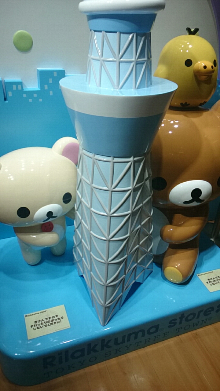 ソラマチの3階3番地、プラレールショップの隣にリラックマストアがありました。店頭には大きなりらっくまとスカイツリーの並んだオブジェがありかわいらしかったです。店内を見つつ、オブジェの写真を撮っている人が多かったです。
