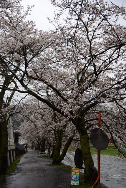 米子方面に旅行へ向かう途中に立ち寄ってみました。駐車場はなかった(どこにあるかわからなかった)と思います。新庄川の堤防沿いの約600mの間に咲く、約50本の桜並木はとてもきれいでした。残念ながら、当日は、雨でしたが、しずくに濡れる桜もなかなかでした。