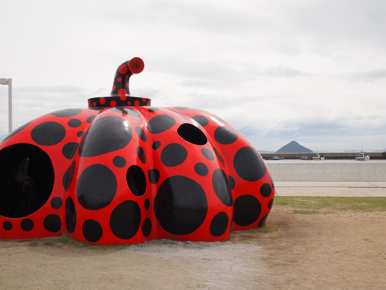 宮浦港のすぐ近くの広い芝生の広場に、1つだけ赤いかぼちゃの展示があります。