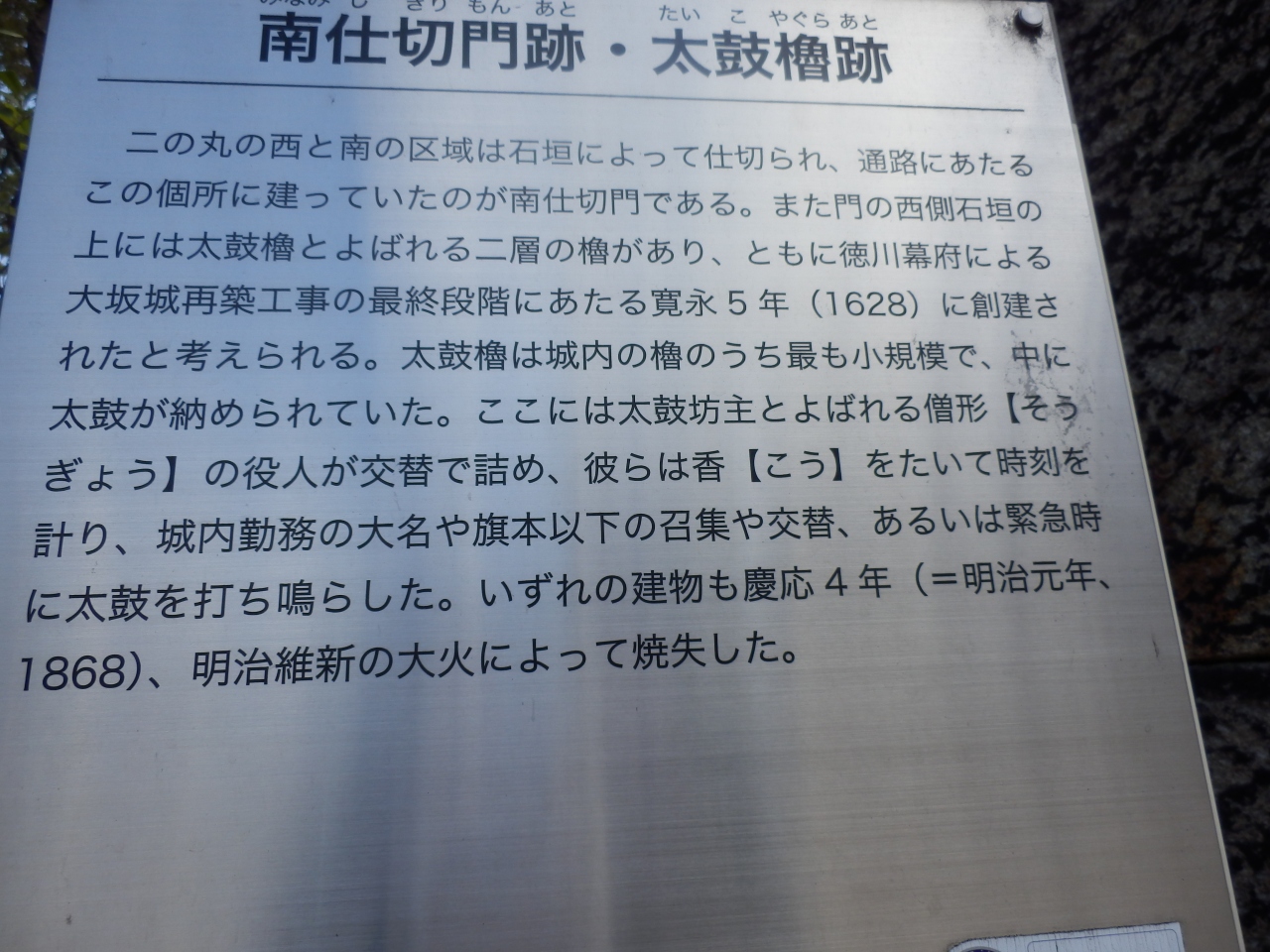 大阪城の二の丸西と南の区域は石垣によって仕切られてる、通路に利用されていた空間、この箇には南仕切門が建っていた、西側の石垣上に太鼓櫓と呼ばれていた二層の櫓がありこれらは徳川時代の寛永五年の大阪城再構築時に創建されたとされています。中に太鼓゛納められていたのでこの名前が付けられたそうです、