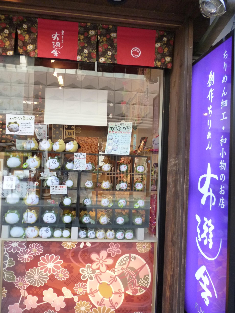 ショーウインドウのは、ちりめんの小物がかわいく飾られていました。なつかしい和のグッズを扱っているのに、なぜか明るくて楽しいお店です。カエルのマスコットが気に入りました。「金かえる」「若がえる」「福かえる」「栄かえる」などなど工夫してありました。