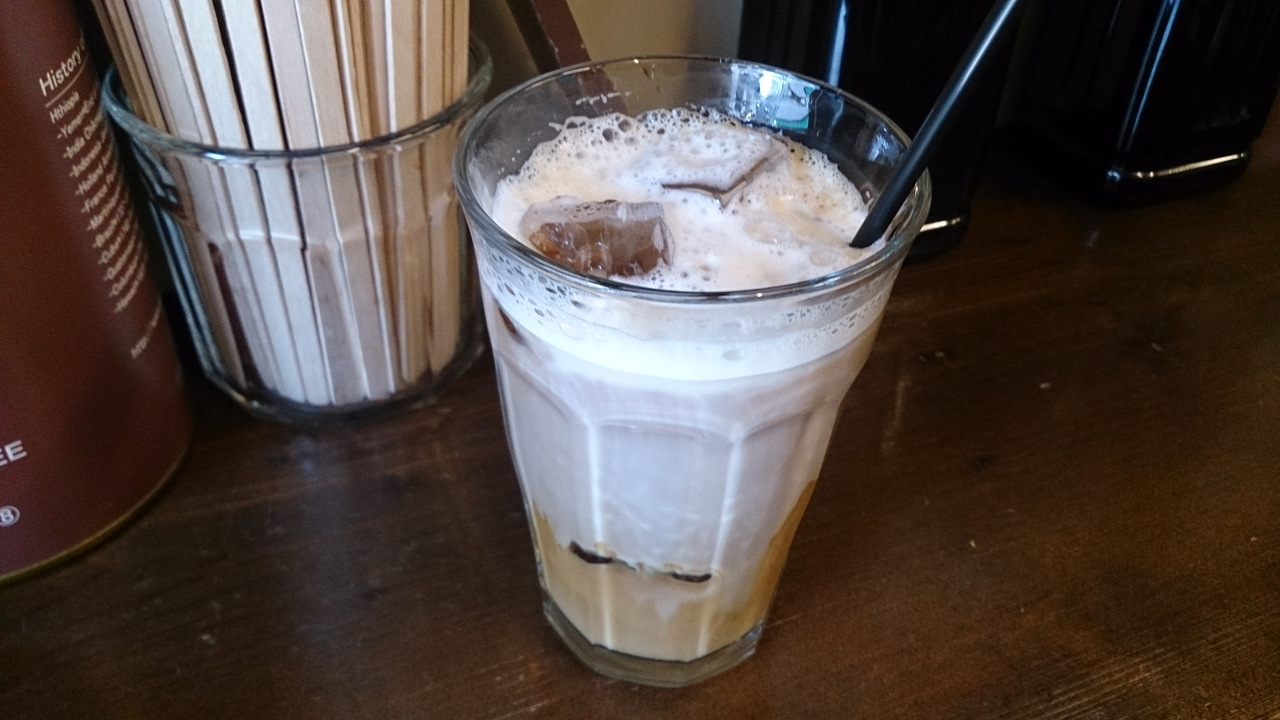 コーヒー豆を購入することもできますが、今回はのどが渇いたのでアイスミルクコーヒー(270円)をイートインでいただきました。