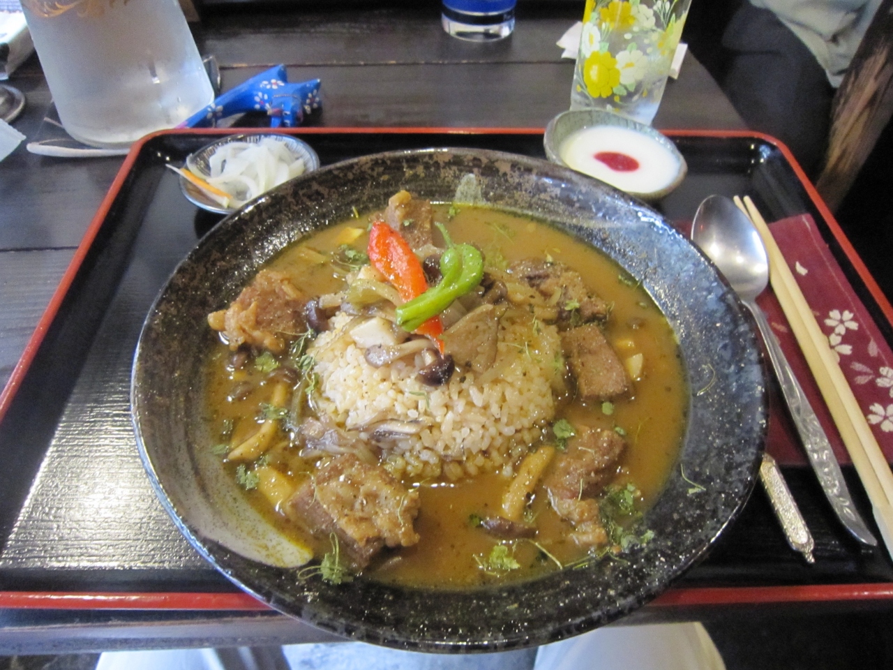 大阪はいからほり商店街の中程にあるカレー専門店。130年の歴史があると言われるレトロな建物で中に入ると昔のミシン等レトロな品物が展示されていました。ランチは薬膳カレー膳で3種類の日替わりカレーから2種類を選択して合いがけするのと単なるカレーがありました。