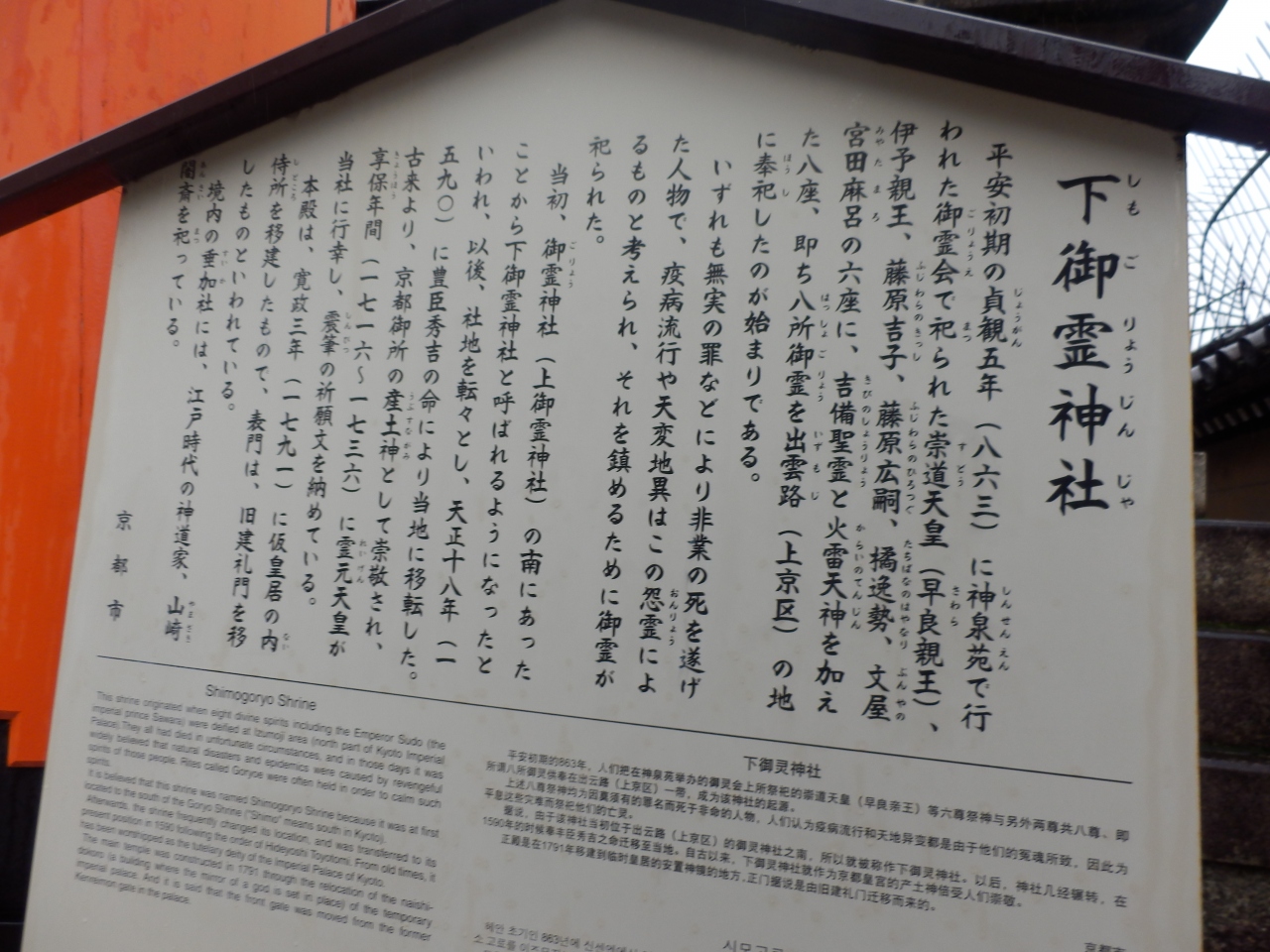 平安時代からの歴史を持つ京都には神社、お寺がすごい数が存在している。知らずに通り過ぎていた神社やお寺でも立札を見て由緒ある神寺だとびっくりすることが多い、京都市が設置した立札によると、下御霊神は古来より京都御所の産土神として崇敬されていたと記されていた、