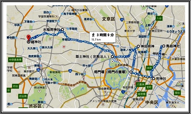 将門に縁があると云われている7つの神社;鳥越神社、兜神社、将門塚、筑土神社、鎧神社、神田明神、水稲荷神社。