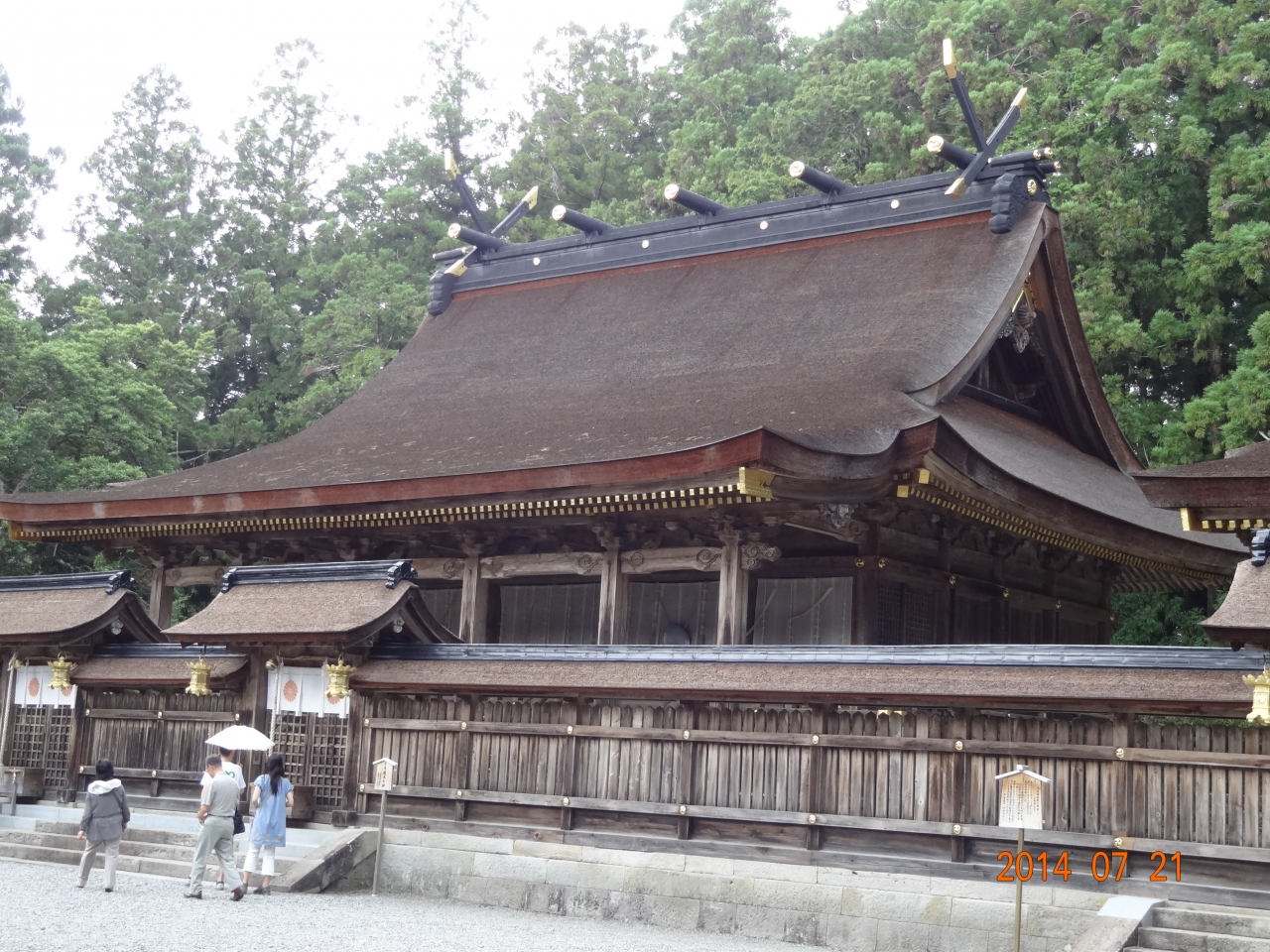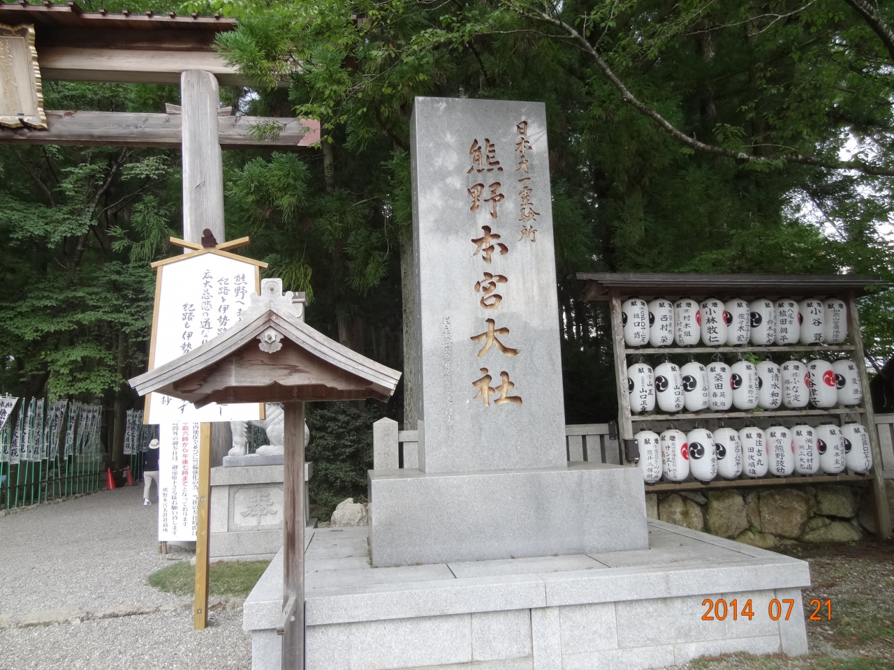 熊野三山の一つで最も奥地にある。国の重要文化財が全体を占めている。三山の中ではもっとも古式ゆかしい建物。昔、洪水がありその難を逃れたもので再築したらしい。昔の場所、大斎原(おおゆのはら)には、日本一の巨大な鳥居がある。