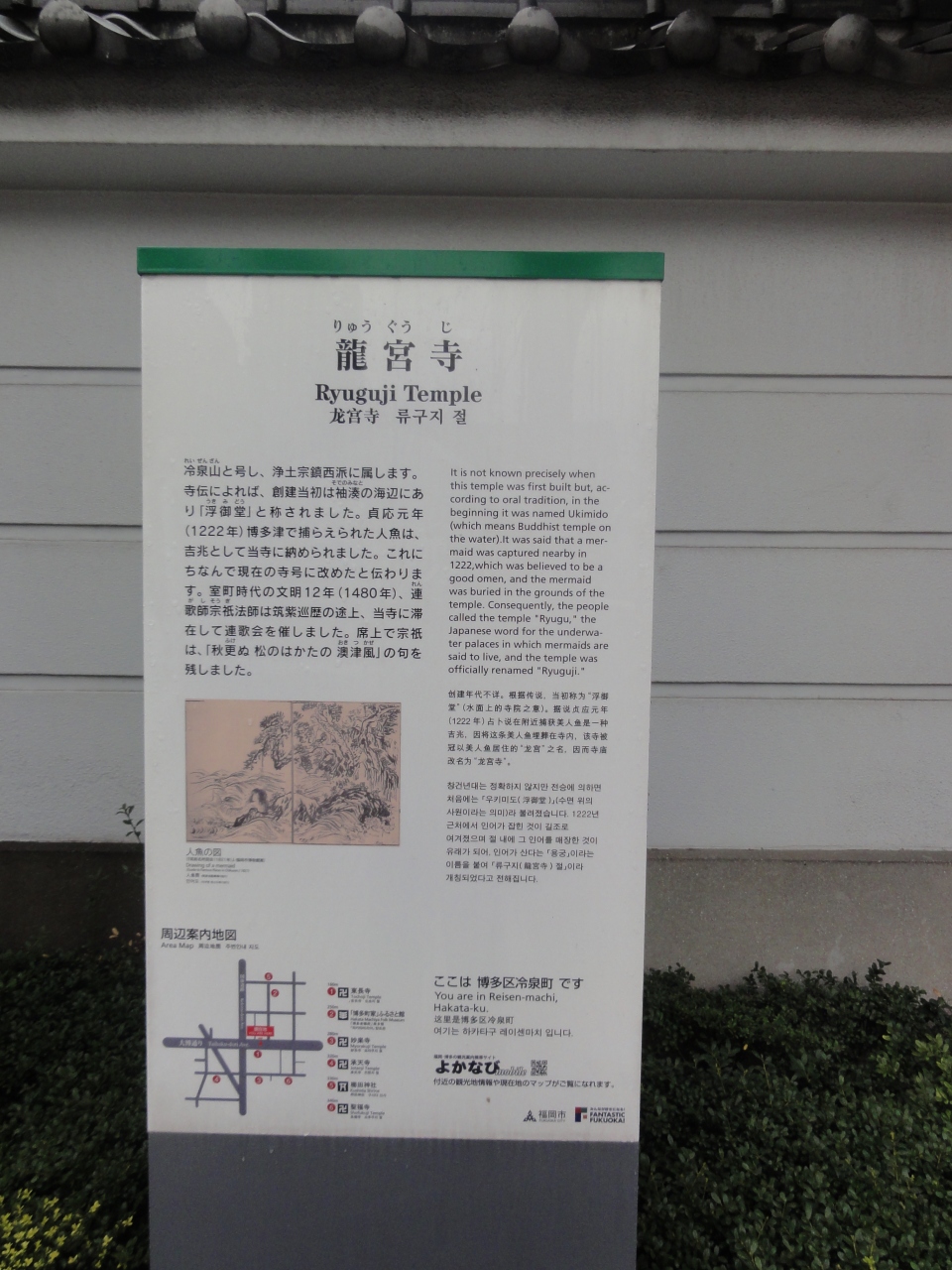 博多の街歩き・寺社町コースで紹介されてるお寺です。境内らしいものもなく、小さなお社と観音堂、人魚塚があります。昔、この辺は海に近く、人魚をここに埋葬した時からお寺の名前を龍宮寺と変えたそうです。御用がある方は社務所へとあり、見ると横に近代的な社務所がありました。