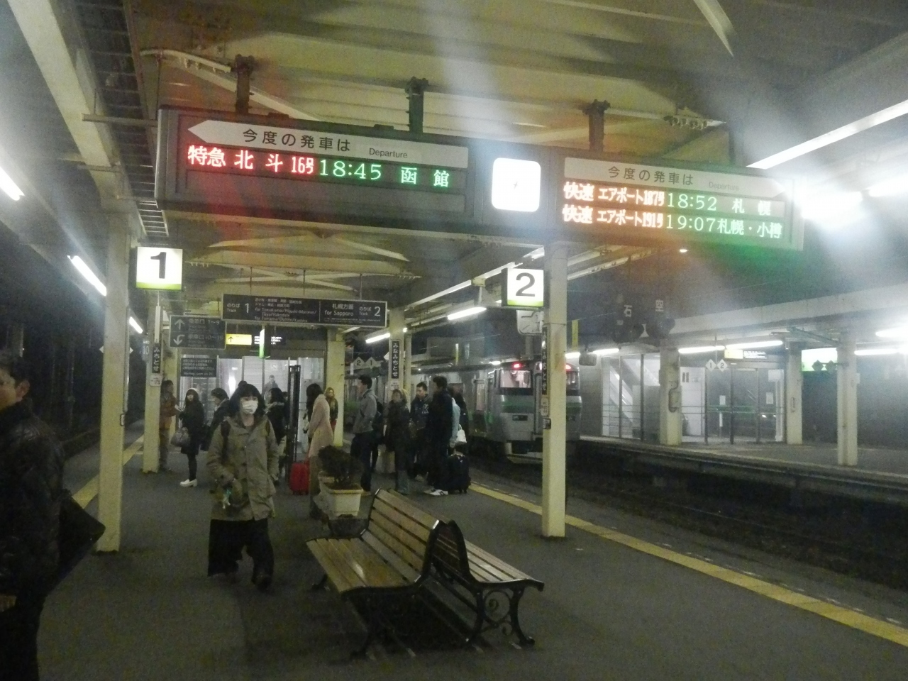 新千歳空港から苫小牧の向かう。南千歳駅で乗り換えようとすると、乗車予定の列車は車両故障のため運休となってしまっていた。次の列車まで1時間以上空くことになった。それでも本来乗れないはずの特急北斗に特別に乗車できることになったので、いくらかは遅れが少なくなった。