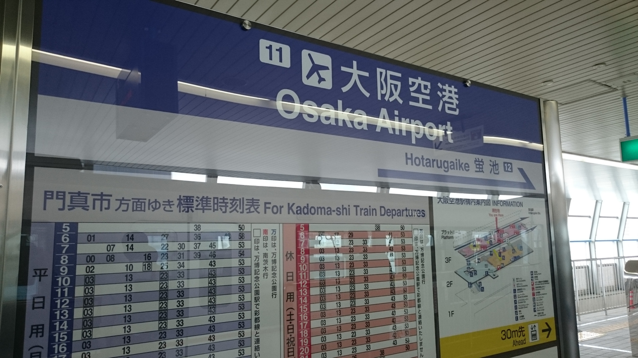 大阪空港駅は大阪モノレールの始発駅であり、大阪市内だけでなく、京都、神戸へも電車利用の場合は利用する駅になりますが、羽田空港のモノレール駅と比べるとかなり質素。しかし、南北ターミナルのちょうど中間にあって、JAL、ANAどちらの利用でも時間に大差なし。ターミナルビルまでは、屋根もあるので傘は不要です。駅構内には自販機くらいしかないので、買い物が必要ならターミナルビルで済ませることをオススメします。