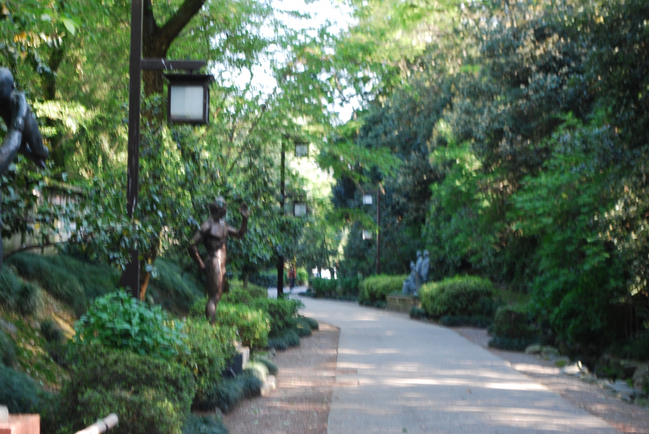 金沢城南側の外堀白鳥掘を埋め立てた兼六園下と大手町を結ぶ細長い散策路がこの公園です。通路の両側に樹木が植えられており緑豊かで、また、随所の彫刻が配置されています。とりわけ、金沢の三文豪、泉鏡花、室生犀星、徳田秋声の銅像が目を引きます。四季折々花が咲き乱れていますが、春の桜の頃、秋の紅葉の頃が見ごたえがあります。