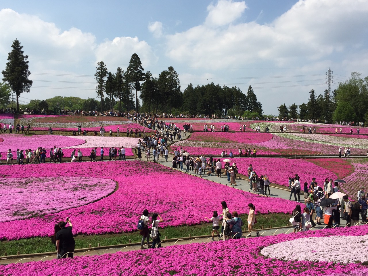 期間中の土日祝日は、公園内に車で入る事ができません。近くの臨時駐車場(500円)に車を止め、無料の、シャトルバスで公園内まで行きました。そこから歩いて10分ほど行くと、ピンクの花じゅうたんが ひろがっています。人はたくさんいましたが、綺麗な風景を堪能できました。