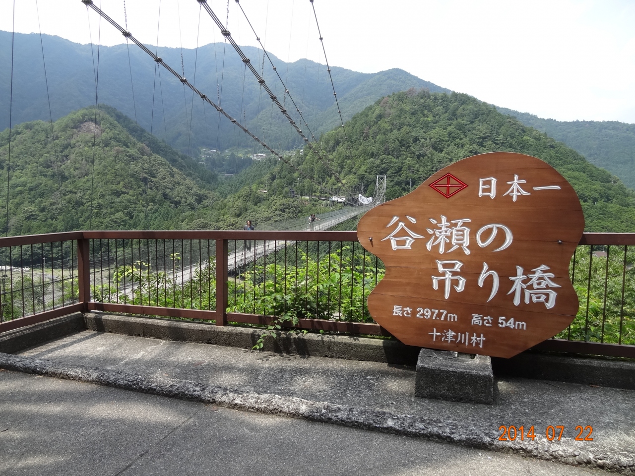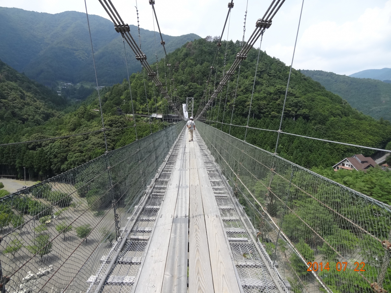 日本一長い吊り橋はいくつもある。ここはおよそ300mの木造の吊り橋。結構揺れるから怖い。また、入場できる人数も制限されている。思わず下を見てしまうが、十津川まで50mほどの高さがあり、高いところの不得手な人はやめた方が良いかと。