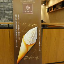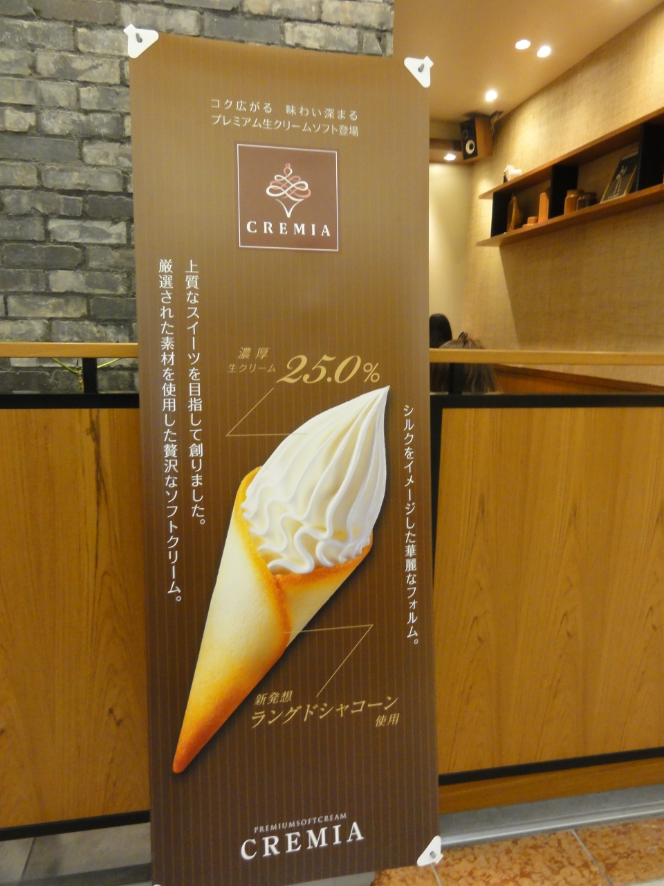 お店の前を通ったら、ラングドシャーのコーン、プレミアム生クリームソフトの旗が目に入りました。これは食べてみなくちゃ、博多に来て初めてのソフトクリームです。