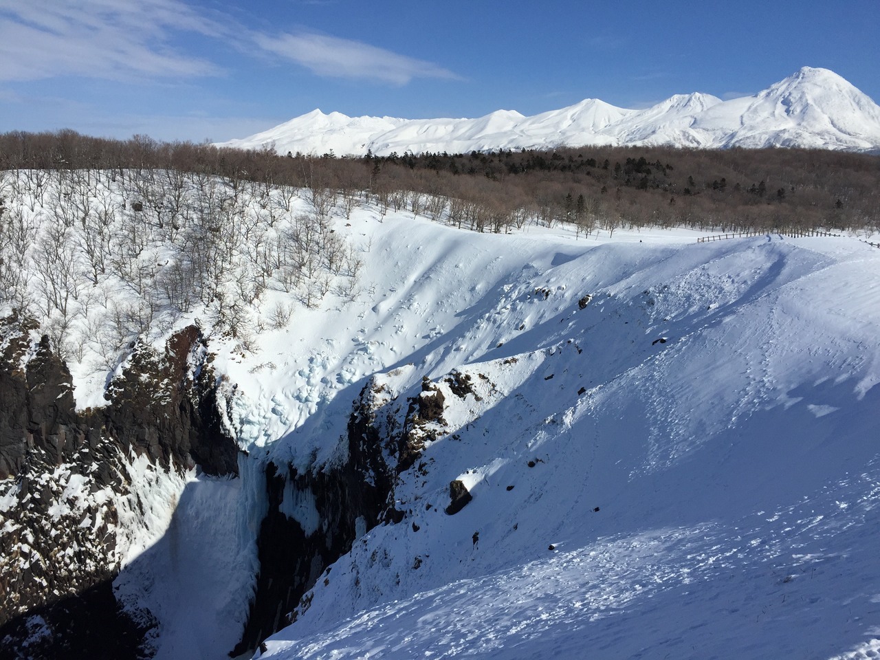 しはらくすると開け 海沿いまで歩くと 海の断崖には凍った滝が!光の加減で綺麗な青に見えるところも。