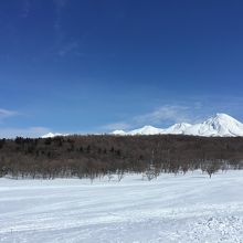 背景には雪をかぶった知床連山が青空に映える 素晴らしい景色だった。