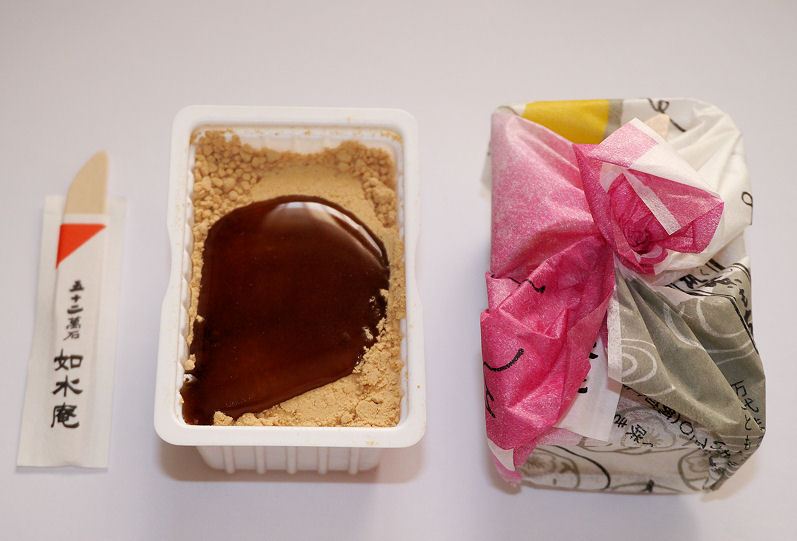 きな粉をたっぷりとまぶしたわらび餅に、別袋で添えられている黒蜜をかけ、楊枝で刺して食べる菓子。