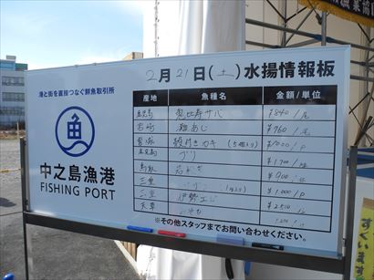 中之島漁港には、その日の水揚げ情報板にて、産地や魚種名、金額が判り易く掲載されているので、その日に購入予定のものの目星を付けて買う事ができます。新鮮な魚をリーズナブルな価格にて購入できますので、ぜひ、一度、利用してみてください。