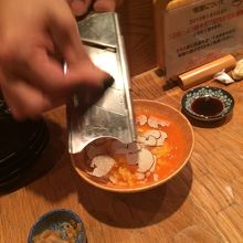 名物トリフの卵がけごはんを〆に注文、二口ぐらいのご飯に卵の黄身をかけ、トリフをスライスする。