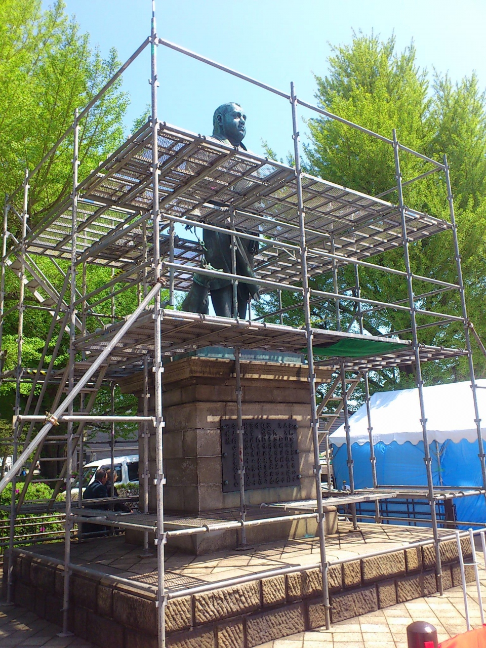 上野公園といえばこの犬を連れた西郷隆盛像があまりにも有名ですが、この日は西郷さんを綺麗に掃除した記念会をやる日だったようです。ただし銅像のまわりには、足場が組まれたままで、西郷さんの勇姿がちゃんと見ることが出来ずに残念でした。