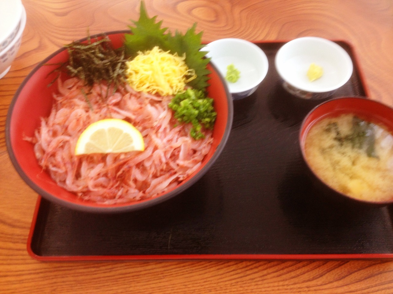 港へ着くと目当ての小川港魚河岸食堂、正面に券売機、壁面にメニュー一覧が料理写真つきで壁一面に大きく掲示してあります。結構なメニュー数があって何を頼めば良いのか何がオススメでおいしいのかがわかりにくい。確かこの辺りの名産は「桜えび」かなって桜えび丼注文しました。昨晩がグルメ三昧でしたので比べてしまうと…なのですが単価もお安くて行く価値はあります。