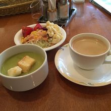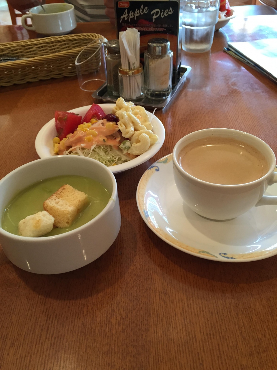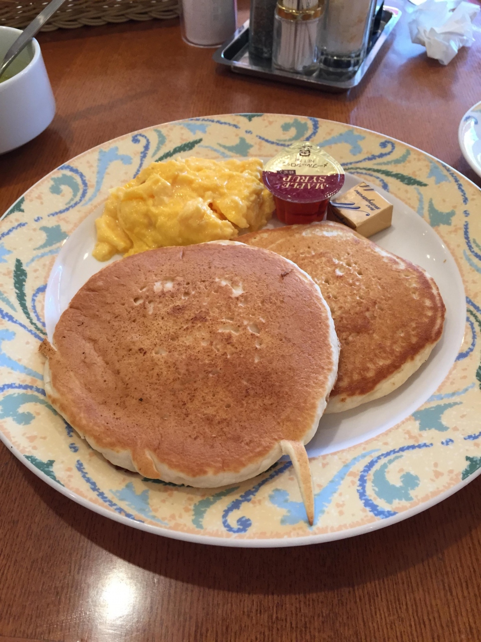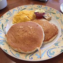 ジミー那覇店では空港にもあるケーキやマフィンの他にお惣菜や野菜、夏はマンゴーも取り扱っています。お店の隣にはアイランドグリルというジミーのレストランが併設されていて普段はグランドメニューの他にビュッフェがあります。ビュッフェでは沖縄料理が並んだりジミーのケーキが食べられます。今回は土日の朝のみやっているモーニングを食べました。パンケーキにスクランブルエッグがついていて、スープ、サラダ、ドリンクはビュッフェになっています。値段は税込で600円でした。
