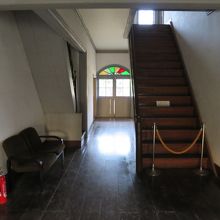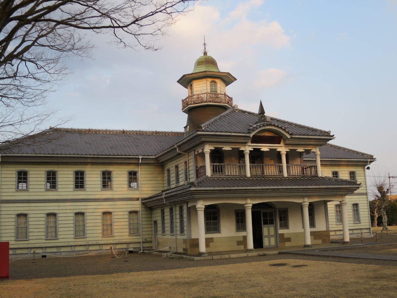旧水海道小学校本館は塔とテラスを持つハイカラな明治期の学校建築で、中では小学区の資料が展示され往時の様子が忍ばれます。