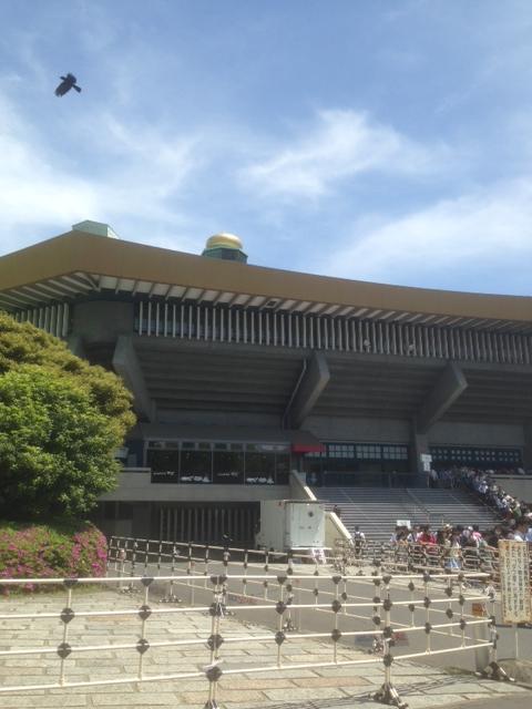 1964年の竣工以来、日本武道の殿堂、そしてミュージシャンの晴れ舞台として、活躍してきた建物です。てっぺんに輝く金色のものは、「擬宝珠」といいます。直径が5メートル以上もあります。