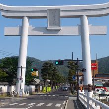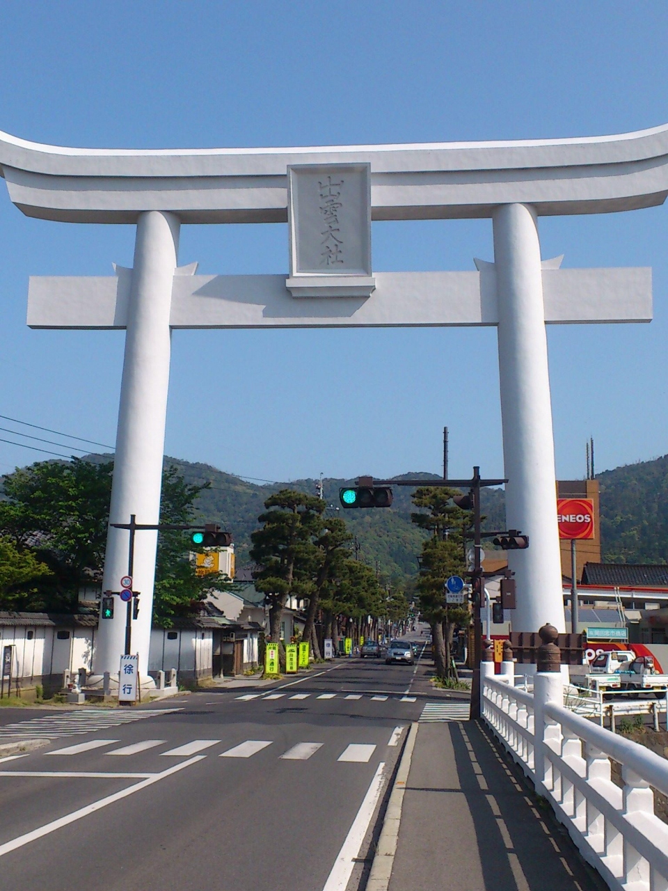 出雲神社の一の鳥居で、宇迦橋のたもとに建っています。この一の鳥居と境内入口の二の鳥居の間に一畑電車の駅があるので、普通はこの鳥居までは戻らないと思います。今回は昔の出雲大社参詣のコースどおりの旧出雲大社駅でバスを降り、歩いて行きました。白い大きな鳥居が見えて来ると、出雲大社に来た雰囲気が湧いてきました。